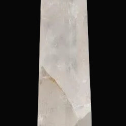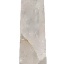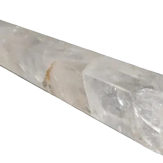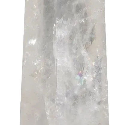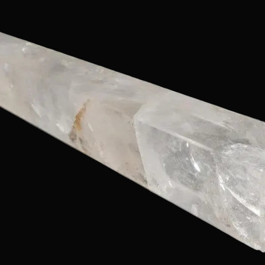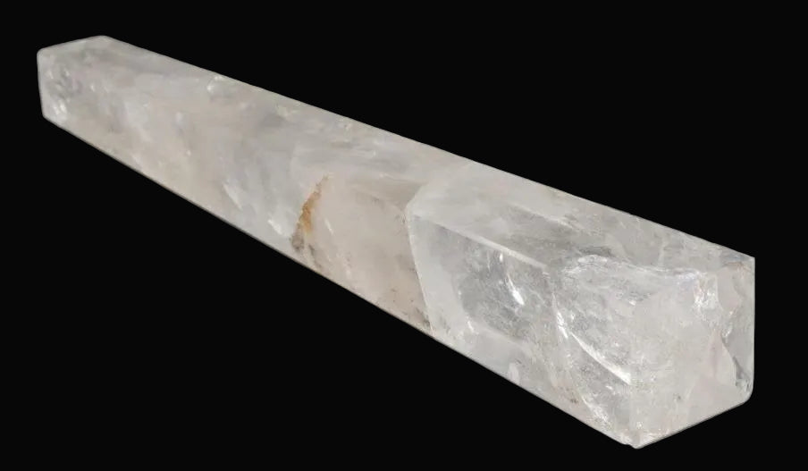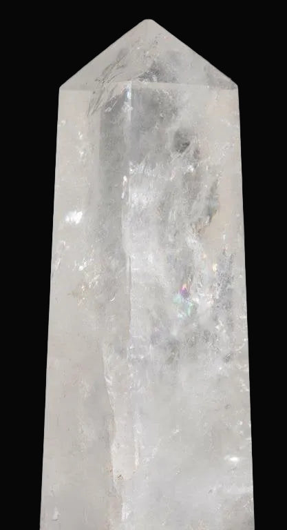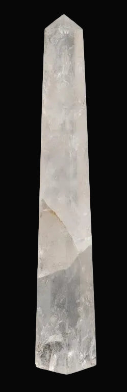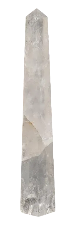 This elegant rock crystal quartz obelisk is carved in a classic tapered form, culminating in a pointed apex. The natural clarity and internal inclusions of the quartz create subtle variations in tone and texture, enhancing the organic beauty of the stone.